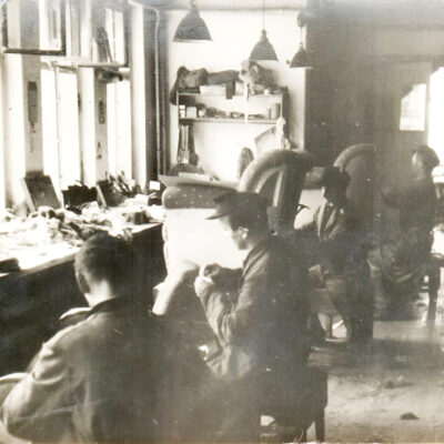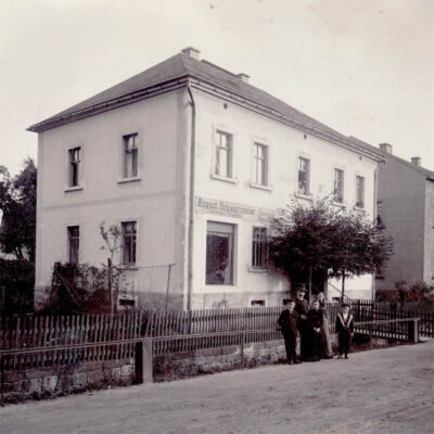 Im Wohnhaus wurde ein Geschäft mit großem Schaufenster eingerichtet, in dem Lederwaren, Dekorationsbedarf und Bodenbeläge angeboten wurden. Das Schaufenster zieht von der linken auf die rechte Gebäudehälfte. Rechts ist der Anbau mit ersten Werkstätten zu sehen.